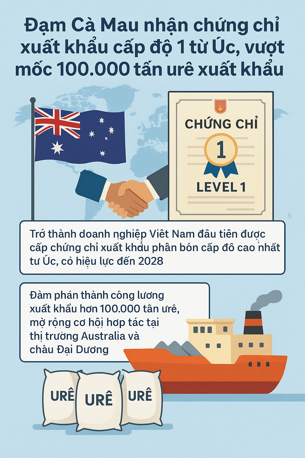Chứng chỉ này giúp Đạm Cà Mau miễn kiểm tra tại cảng đến ở Úc, qua đó tiết kiệm thời gian, chi phí logistics và nâng cao năng lực cạnh tranh trên thị trường quốc tế. Đây là thành quả sau đợt đánh giá thực địa nghiêm ngặt vào tháng 3/2025, thể hiện sự công nhận toàn diện đối với chất lượng sản phẩm urê hạt đục Cà Mau – từ tiêu chuẩn an toàn sinh học, truy xuất nguồn gốc, đến hạ tầng và kiểm soát chuỗi cung ứng.