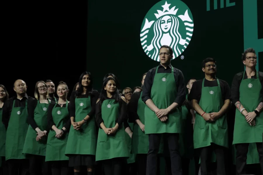 Các nhân viên pha chế của Starbucks đứng trên sân khấu, ngày 20 tháng 3 năm 2019, trong cuộc họp cổ đông thường niên tại Seattle. (Ảnh AP/Ted S. Warren, tệp)