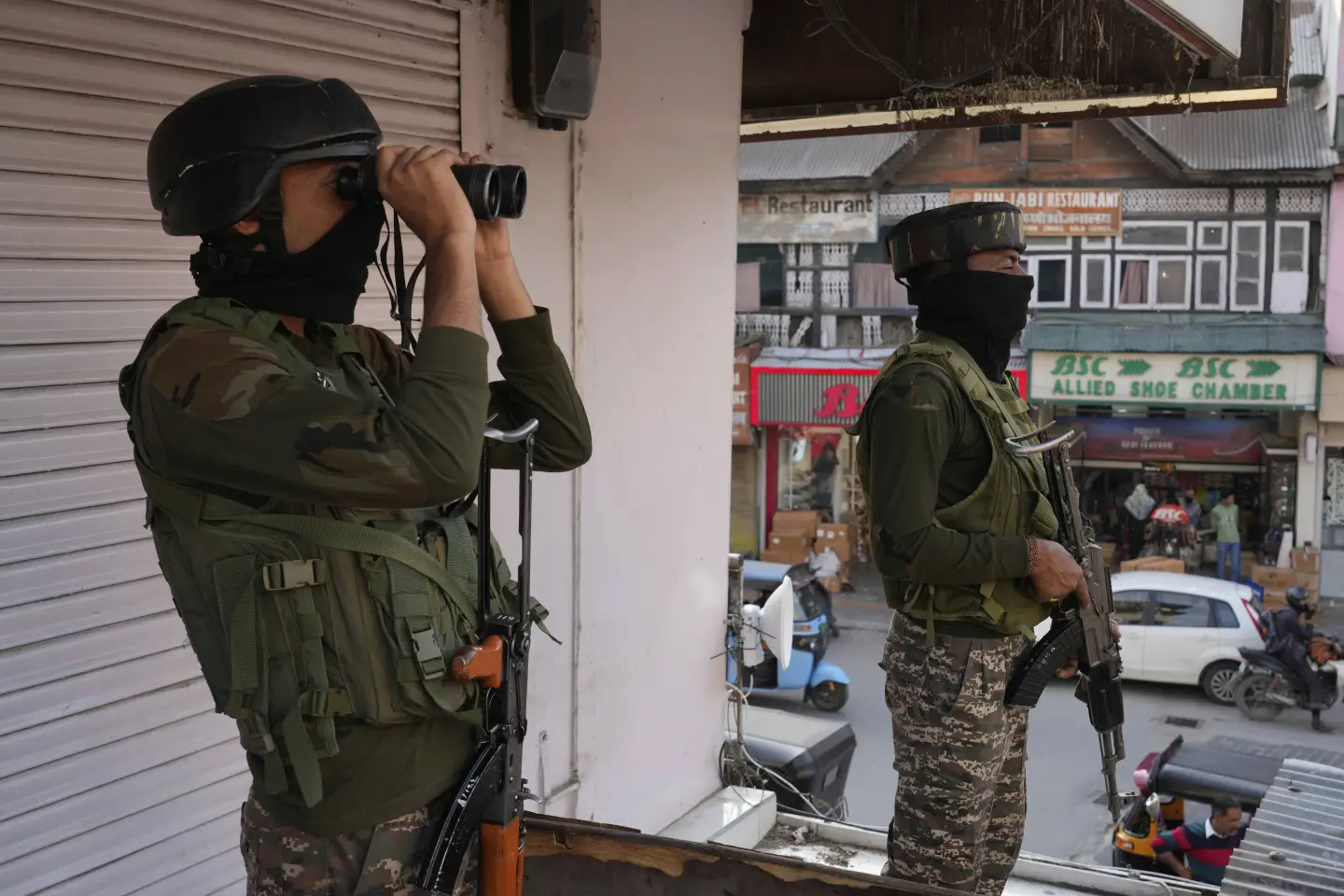 Binh lính Ấn Độ canh gác tại một khu chợ ở Srinagar, Kashmir do Ấn Độ kiểm soát, thứ Ba, ngày 6 tháng 5 năm 2025. (Ảnh AP/Mukhtar Khan)